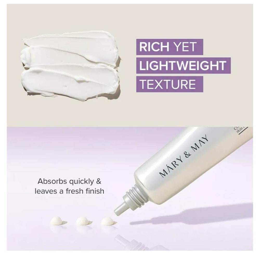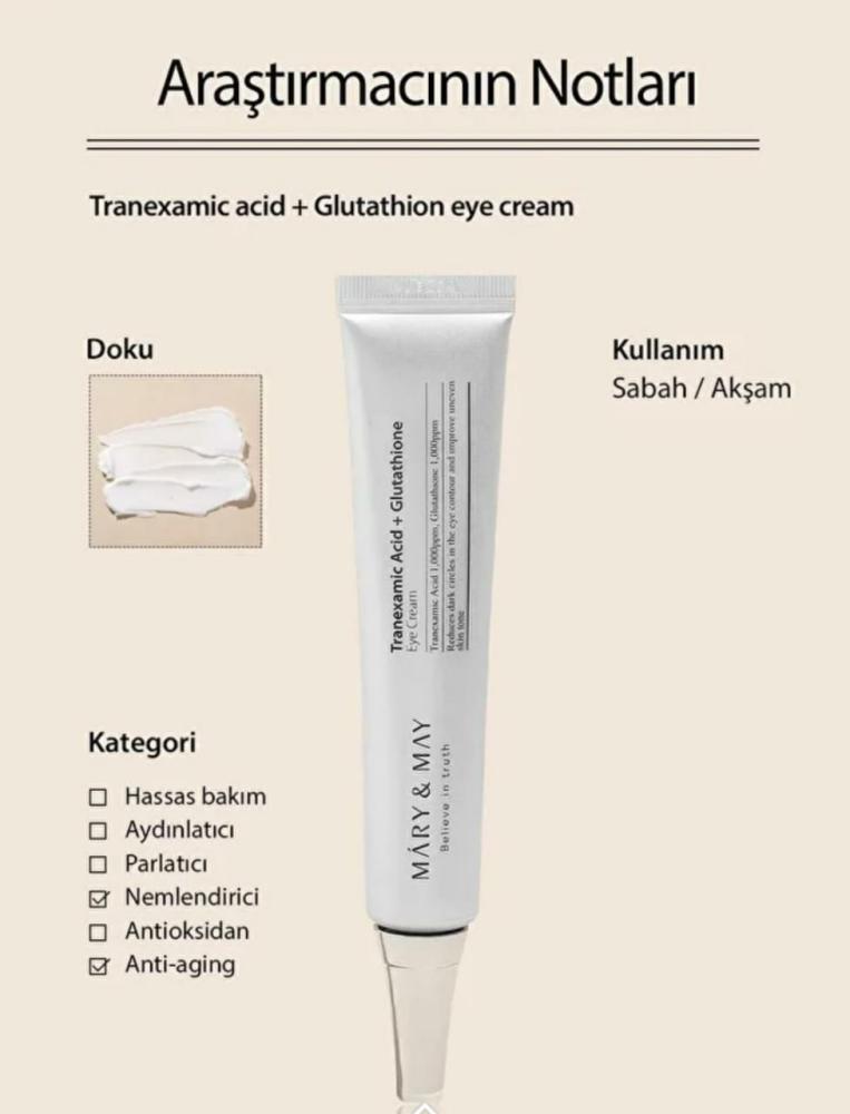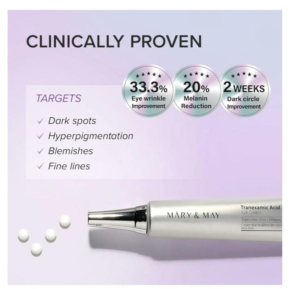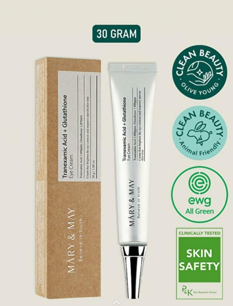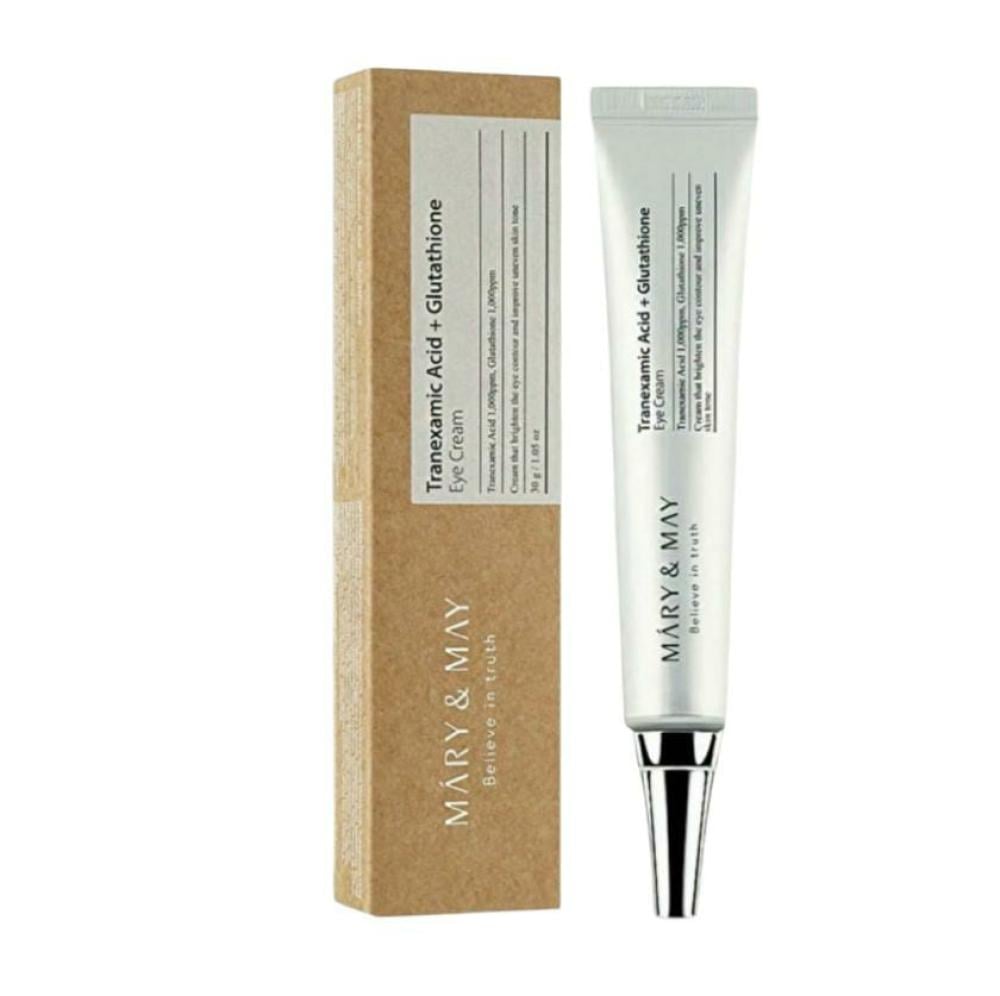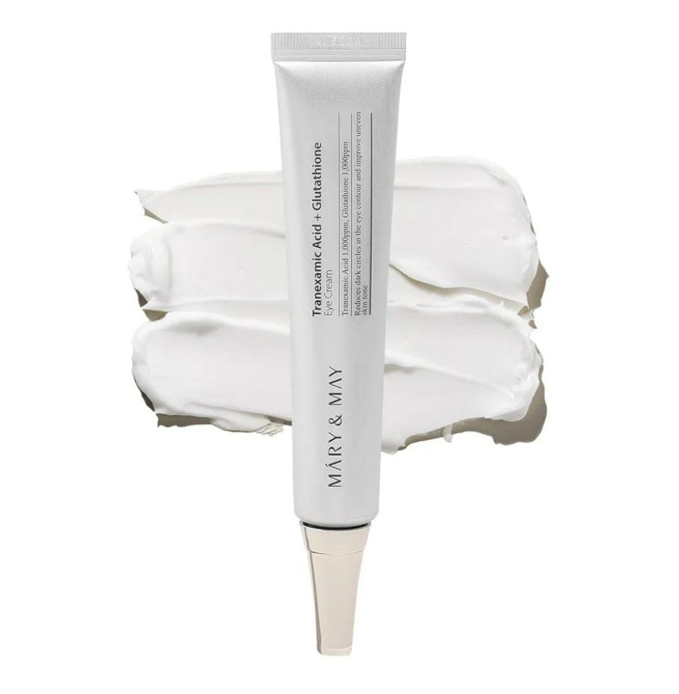 ماري اند ماي كريم العين من ترانيكساميك حمض + جلوتاثيون - مضاد قوي للأكسدة، يقلل الهالات السوداء في العين، يحسن لون البشرة غير المتساوي مع فيتامين C - مناسب للاستخدام في الصباح والليل _ 30 جرام. Mary & May