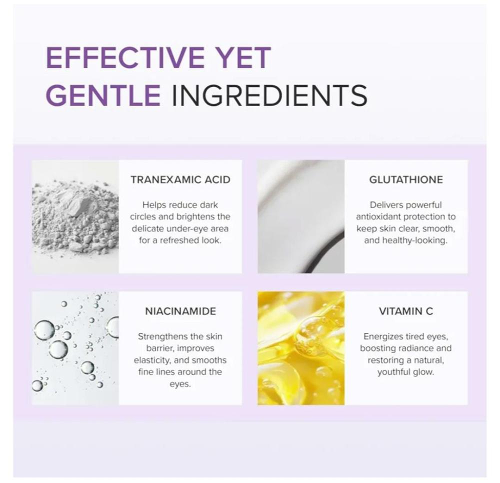 غني بـ 1000 جزء في المليون من حمض الترانيكساميك والجلوتاثيون، كريم العين هذا يضيء الهالات السوداء وينشط البشرة حول العينين. كما أنه يحتوي على فيتامين سي لتحفيز إنتاج الكولاجين وتحسين لون البشرة الباهت.