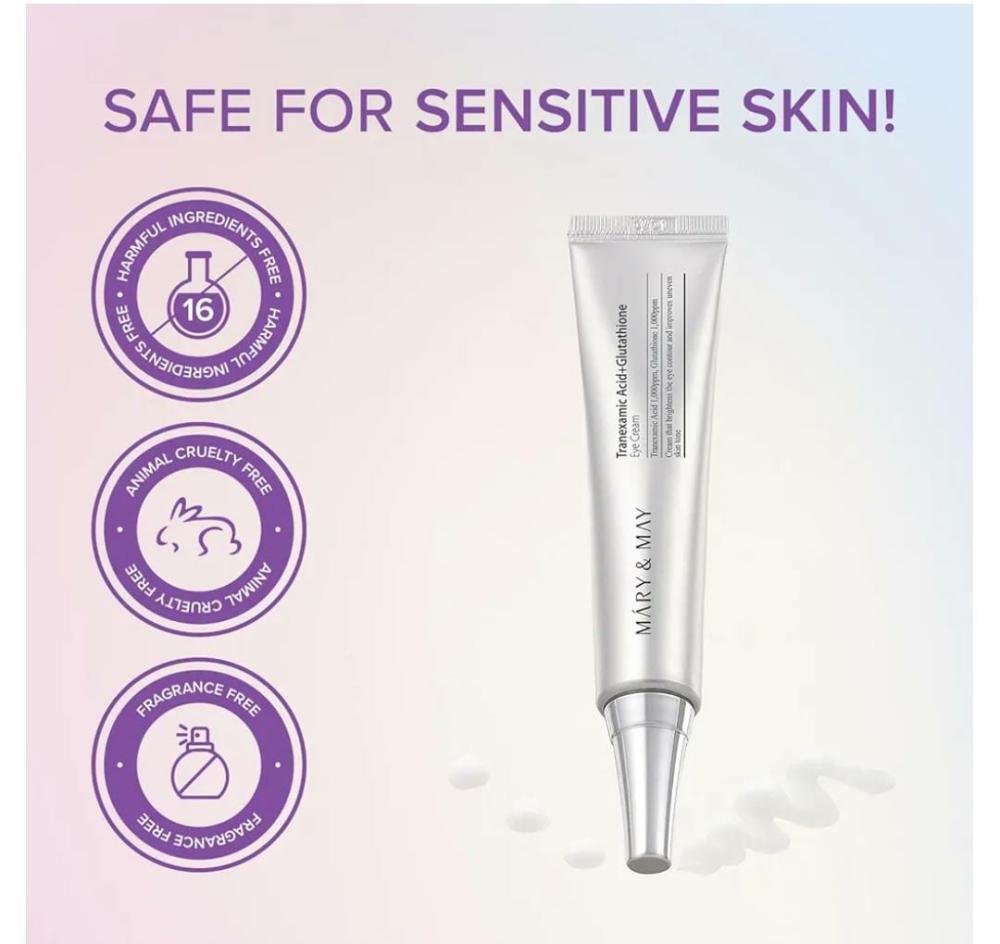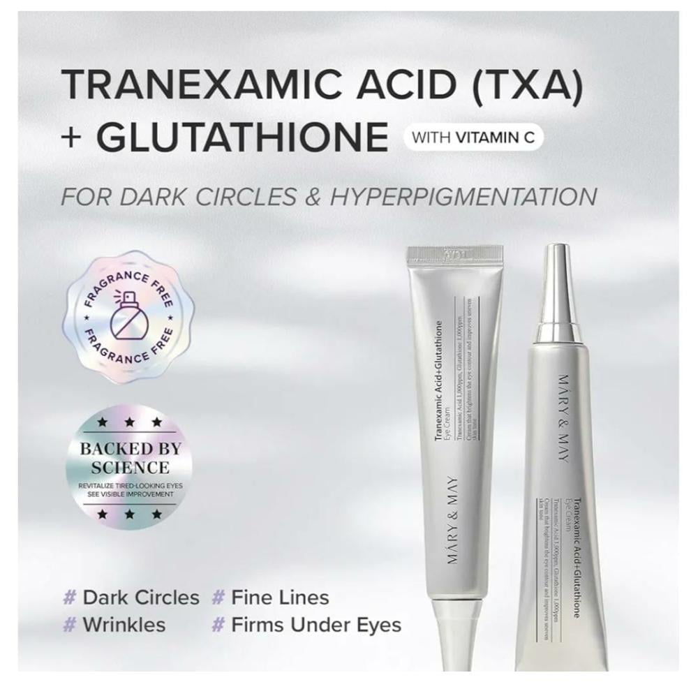 ماري اند ماي حمض الترانيكساميك + كريم العين الجلوتاثيون، 1000 جزء في المليون حمض الترانيكساميك، 1000 جزء في المليون الجلوتاثيون للعناية المركزة للهالات السوداء في محيط العين