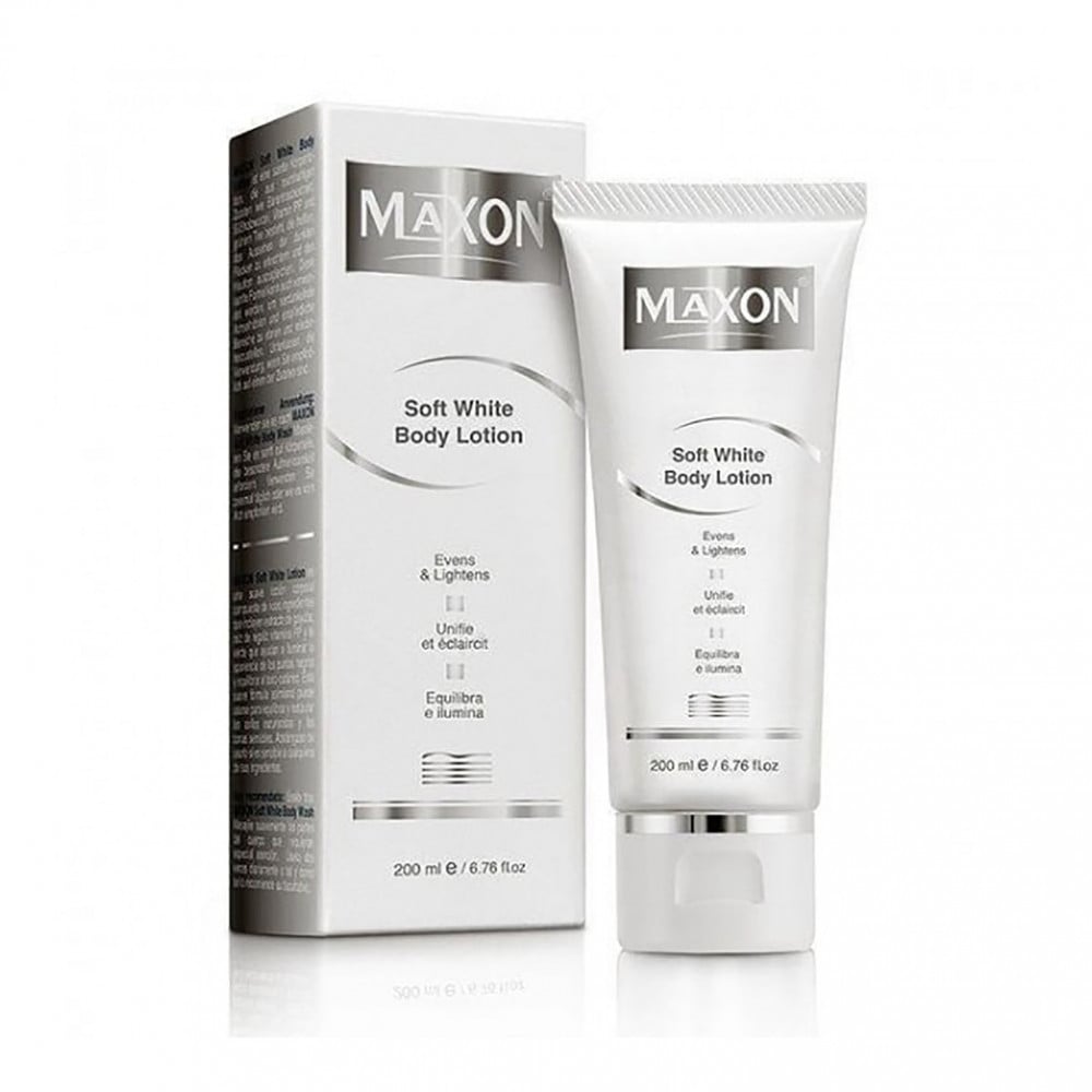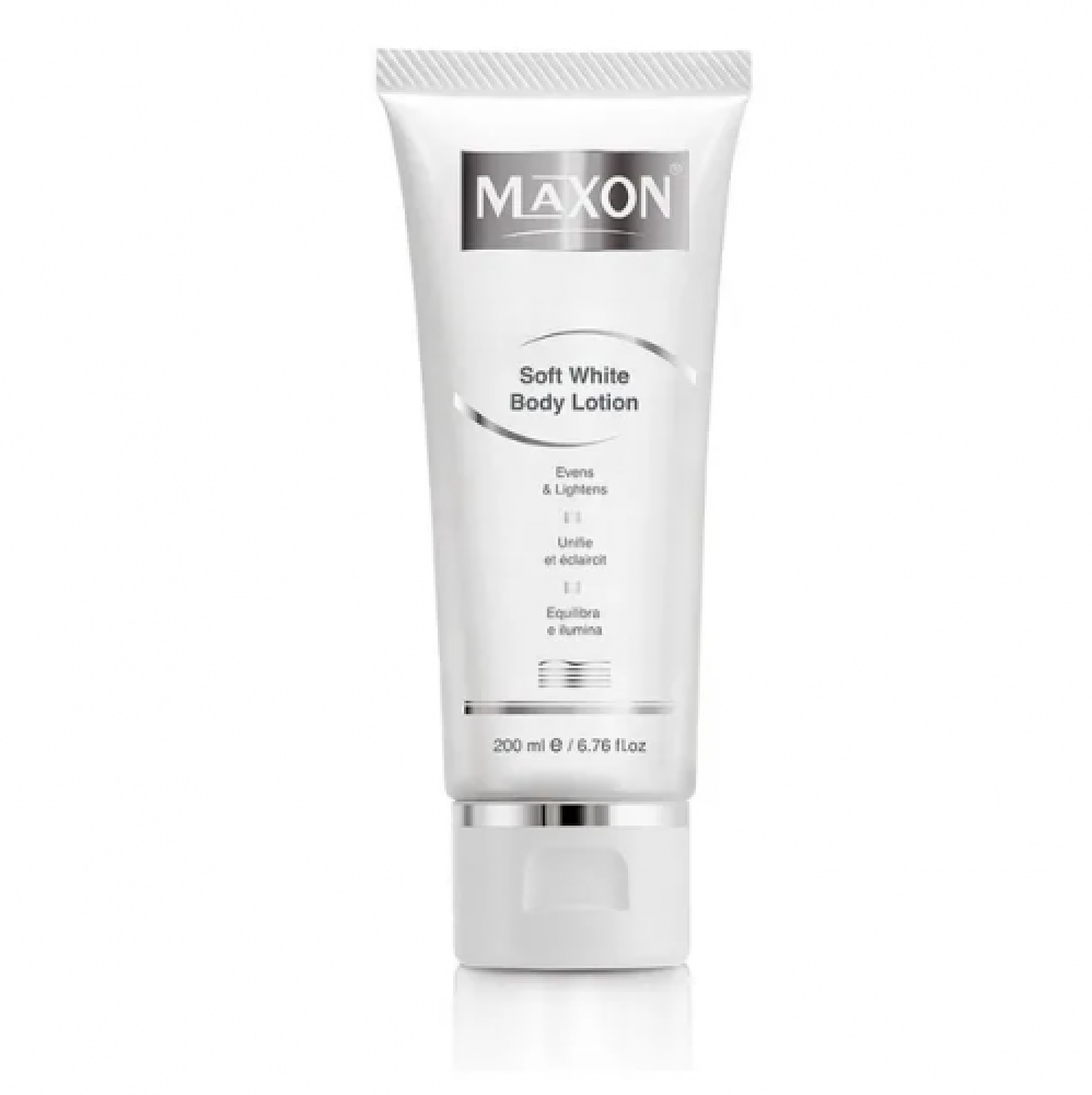 ماكسون سوفت الأبيض لوشن للجسم لوشن مبيض للجسم غني بجذور عرق السوس، وفيتامين بي والشاي الأخضر، يعمل على تفتيح البقع الداكنة ويوحّد لون البشرة وترطيبها ويزيد من افراز الكولاجين وحمض اللاكتيك واليوريا وزبدة الشيا والجوجوبا ويغذى البشرة.يحسن من علامات تمدد الجسم ويعطي نضارة فائقة ونعومة