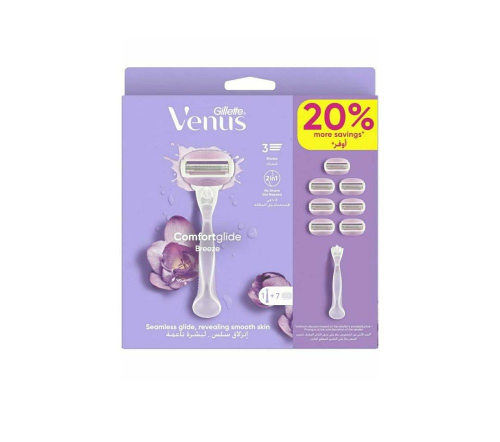 تتميز ماكينة الحلاقة جيليت فينوس كومفورت جلايد سبا بريز للنساء بـ 7 شفرات قابلة لإعادة التعبئة لاستخدام طويل الأمد. قضبان جل حلاقة مدمجة لمزيد من الراحة. رأس حلاقة مرن لحلاقة ناعمة ودقيقة. يوفر تجربة حلاقة منعشة ومدللة.