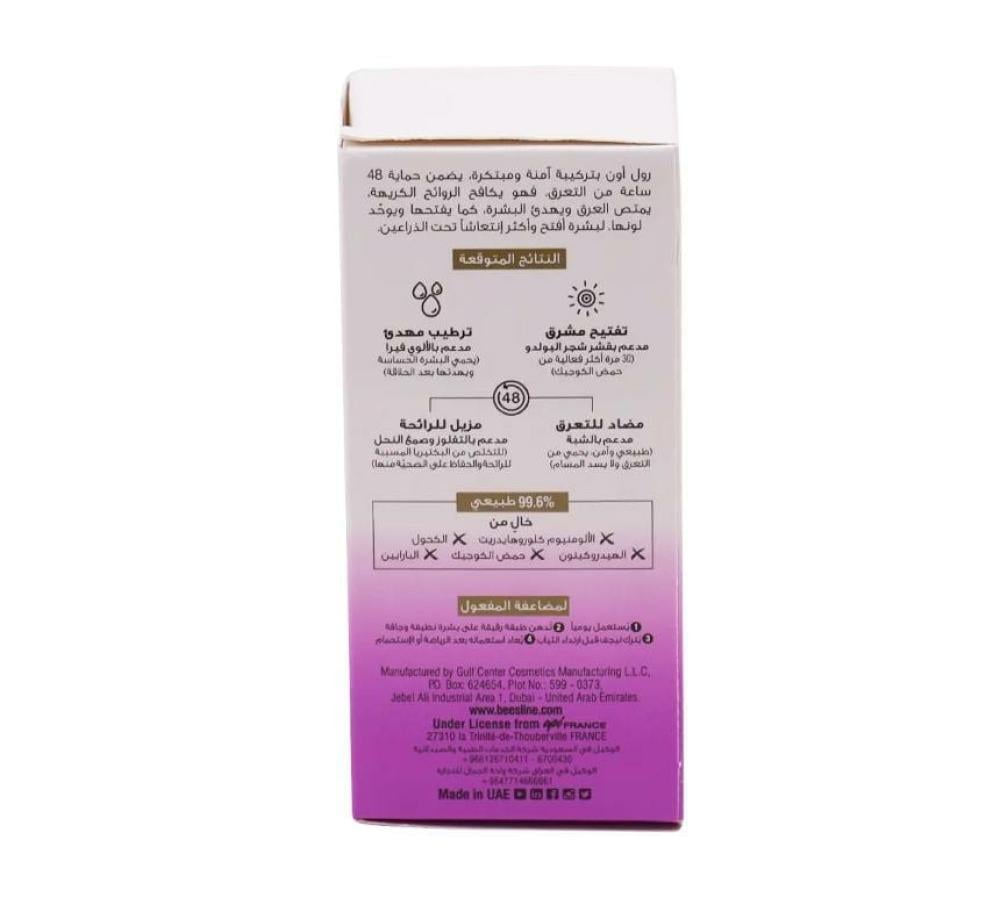 مزيل لرائحة العرق – انتعاش تالق اللؤلؤ ، لطيف وغني بالتفلوز و هى تكنولوجيا جديدة تحدّ من إفراز الجسم للروائح الكريهة مع المحافظة على البيئة الجلديةفهو: يهدّئ ويرطّب البشرة الحساسةو مضاد فعّال للبكتيرياآمن وفعّال، يؤمن النقاوة والانتعاش تحت الابطالمكونات : تفلوز، حجر الشبّة، لوميسكن، حمض اللبن، ملح حمض اللبن، صمغ النحل، ألوي فيرا وورق البقدونسطريقة الاستخدام : تُدهن طبقة رقيقة على بشرة نظيفة وتُترك لتجف تماماً قبل ارتداء الثياب.”
