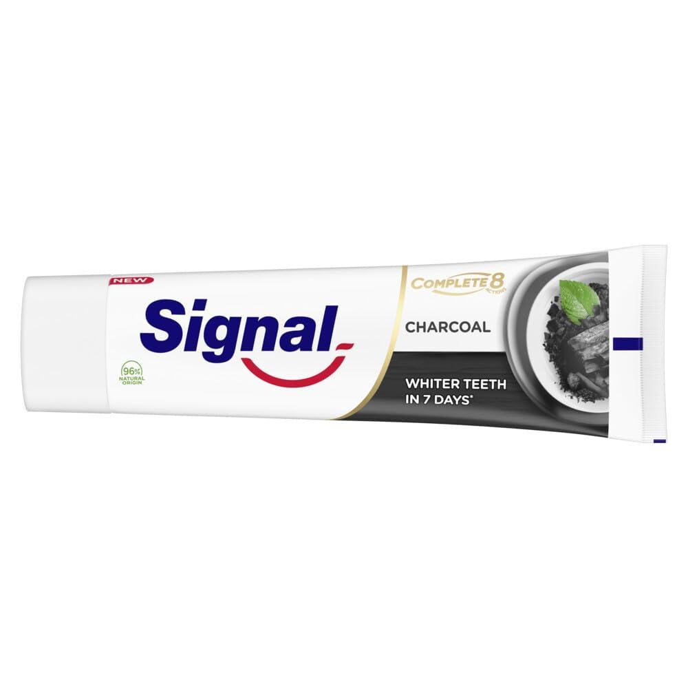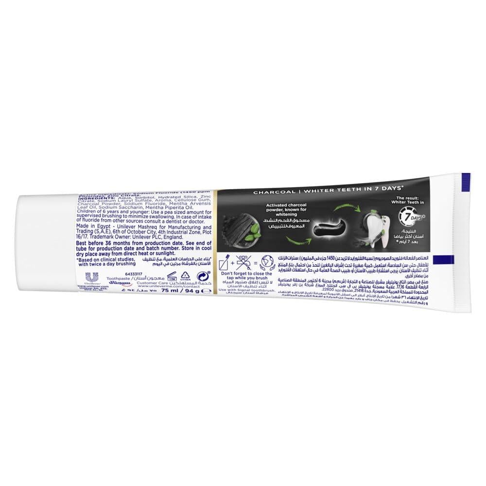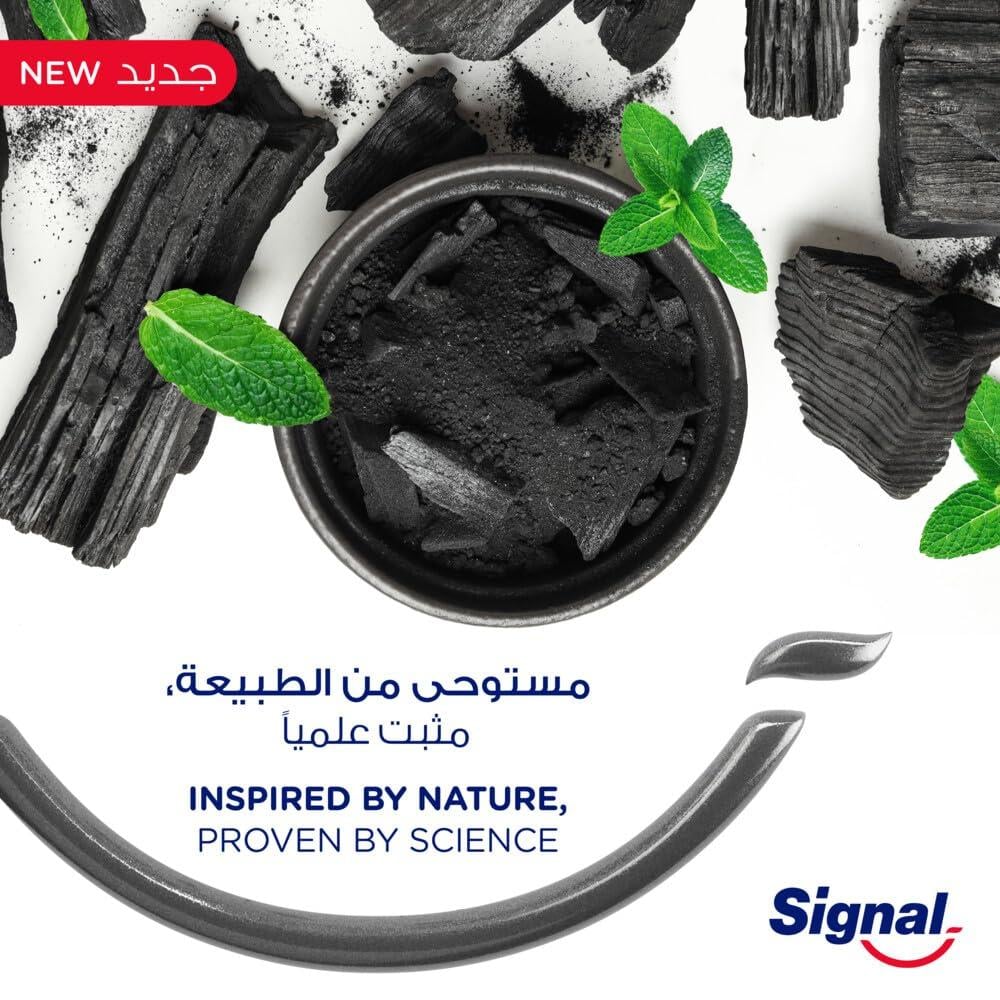 اعتن بصحتك الفموية كما لم تفعل من قبل مع معجون الأسنان سيجنال المتكامل ٨ المبيض للأسنان والمزود بالفحم وعناصر طبيعية. ابتسم لتُظهر أسنانك البيضاء والنظيفة! يحتوي هذا المعجون على معادن الزنك ذات المصادر الطبيعية والتي أُثبت علميًا أنها تحارب البكتيريا لتصبح أسنانك صحية أكثر وابتسامتك أكثر روعة في أسبوعين فقط. ولقد صنعت تركيبته من مكونات ذات مصادر طبيعية بنسبة ٩٦٪ لتزداد أسنانك صحة وبياضًا. ويحتوي معجون سيجنال للأسنان على فحم طبيعي١٠٠٪. ساعد جميع أفراد أسرتك على الاعتناء بصحتهم الفموية واتبعوا جميعًا هذه الخطوات البسيطة: أولًا: في الصباح، نظفوا أسنانكم بالفرشاة وبمعجون الأسنان من سيجنال واغسلوا أفواهكم بغسول الفم من سيجنال. ثانيًا: ليصبح نفسكم منعشًا طوال اليوم، استخدموا غسول الفم من سيجنال، وثالثًا: في الليل، نظفوا أسنانكم بمعجون الأسنان وفرشاة الأسنان من سيجنال واغسلوا أفواهكم بغسول سيجنال للفم. ولا تنسى أن تستبدل رأس الفرشاة برأس آخر كل ثلاثة أشهر وقم بزيارة طبيبك بشكل منتظم. ولا تبتلع معجون الأسنان. سيجنال تعتبر أن كل ابتسامة مهمة! للأطفال ما دون الست سنوات: ضع كمية قليلة من المعجون على الفرشاة وأشرف على عملية تنظيف الأسنان بالفرشاة. نحن، أسرة سيجنال، نؤمن بأن كل ابتسامة قيّمة! لا تدع أي أمر يخطف ابتسامتك وسعادتك ولا تهمل صحتك الفموية. وما زلنا نعمل منذ أكثر من ٢٥ عامًا على تعزيز الصحة الفموية في المجتمعات عبر: أولًا: البرامج المدرسية التي يرعاها عدد من الأساتذة، والممرضين، والمتطوعين حول العالم. ثانيًا: جلسات مجانية للاطمئنان على صحة الأسنان، وثالثًا: تزويد العائلات بالموارد والأدوات التي تساعد على اكتساب عادات سليمة للحفاظ على الصحة الفموية. ونطمح الآن إلى توسيع نطاق نشاطاتنا لنترك بصمتنا في حيوات أكبر عدد من الناس ولنحثهم على الاستفادة من برامجنا. تخلص من كل ما يضر بصحتك الفموية وأظهر لآلئك البيضاء. ونعمل بالتعاون مع خبراء مخضرمين على تحسين الصحة الفموية على صعيد عالمي. الأمر الذي جعل سيجنال والاتحاد العالمي لطب الأسنان يدخلان في شراكة ويعملان معًا للحصول على نتائج مذهلة. ويُذكر أن هذا الاتحاد يضم أكثر من مليون طبيب أسنان من جميع أنحاء العالم. وحتى هذه الساعة، تمكنت سيجنال من أن ترسم أكثر من ١١٣ مليون ابتسامة على الوجوه حول العالم. اختر الأفضل لأسنان أكثر بياضًا بعد ٧ أيام* *وفقًا لدراسة إكلينيكية حول تنظيف الأسنان بالفرشاة مرتين يوميًا