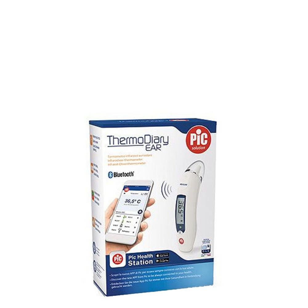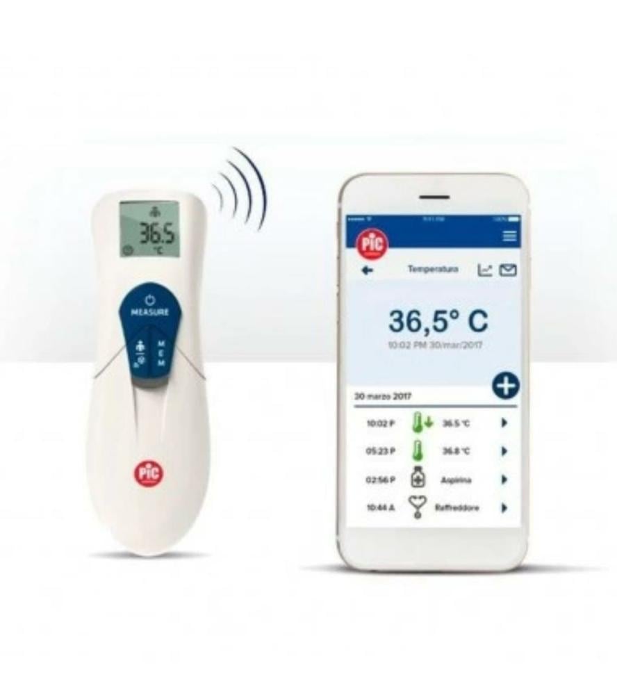 مقياس الحرارة بالأشعة تحت الحمراء PIC ThermoDiary Head هو مقياس حرارة للجبين بالأشعة تحت الحمراء بدون لمس ويمكن مزامنته مع هاتفك الذكي أو استخدامه كمقياس حرارة عادي. ماذا يفعل من أجلك؟ يقيس مقياس الحرارة بالأشعة تحت الحمراء PIC ThermoDiary درجة حرارة جسم طفلك أو الطعام أو الشراب أو درجة حرارة الغرفة: كل ما عليك فعله هو الضغط على الزر وتحريك المستشعر نحو جبهتك والتوقف عندما يخبرك مؤشر الصوت بذلك. في غضون ثوانٍ قليلة ستحصل على قراءة دقيقة لدرجة الحرارة. يُظهر لك مؤشر الحمى على الفور ما إذا كانت درجة الحرارة مرتفعة (وجه حزين) أو طبيعية (وجه مبتسم). وإذا كان طفلك نائمًا، فما عليك سوى استخدام الوضع الصامت لقياس درجة حرارته دون إيقاظه.