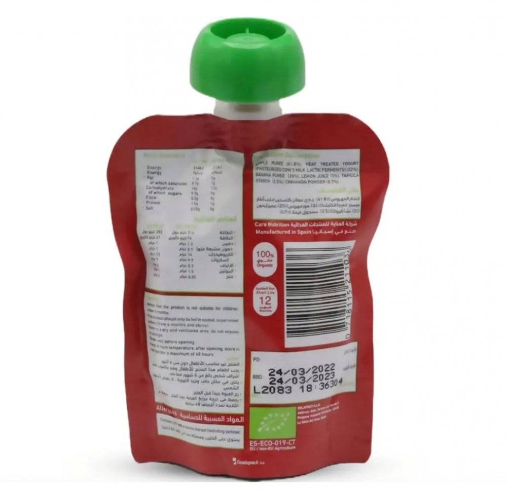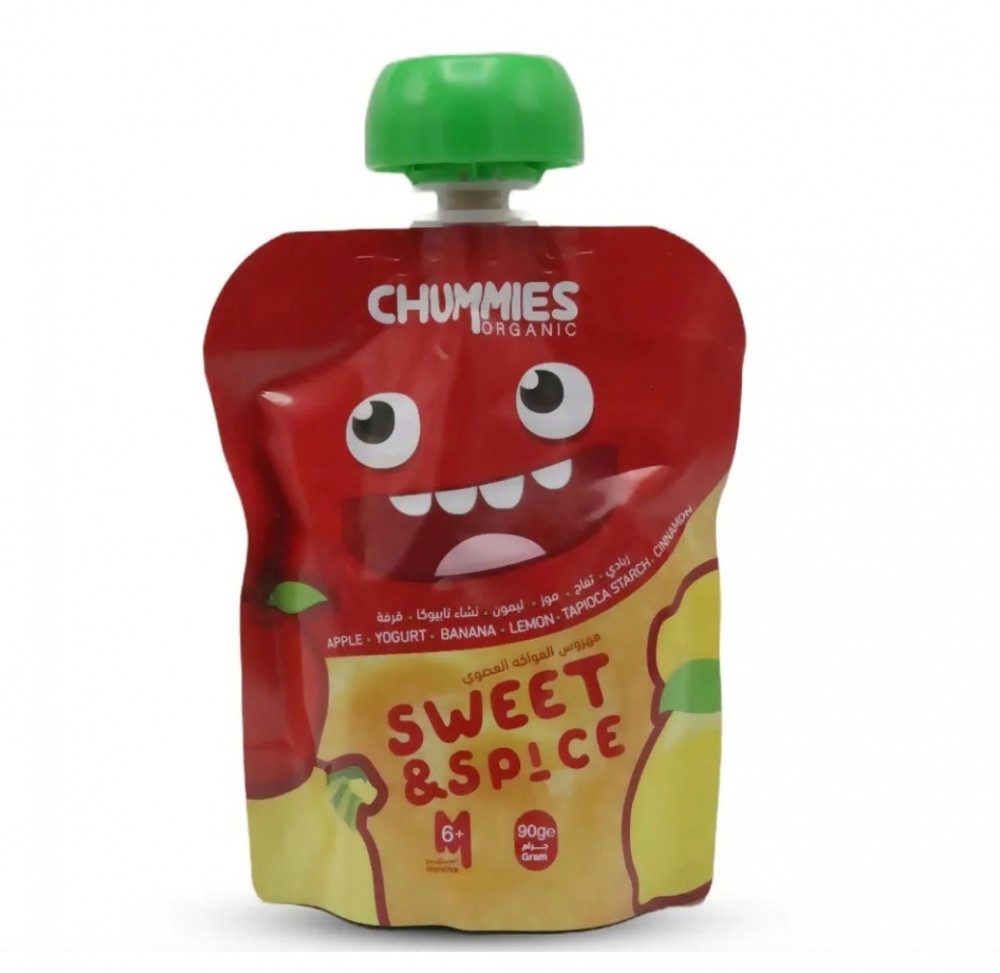 Chummies Organic Sweet & Spice - عبارة عن مزيج من هريس التفاح واللبن (المبستر) وهريس الموز وعصير الليمون ونشا التابيوكا ومسحوق القرفة