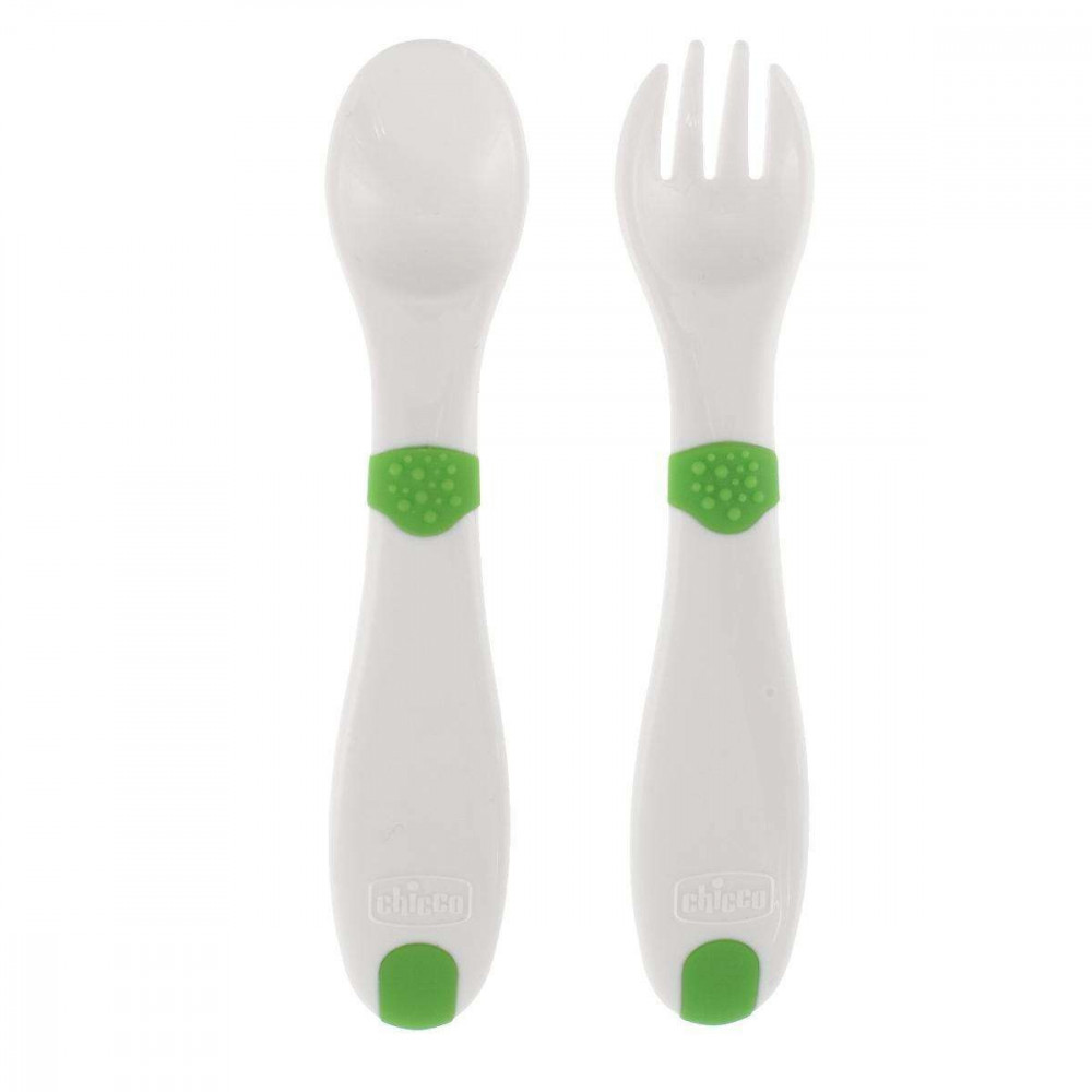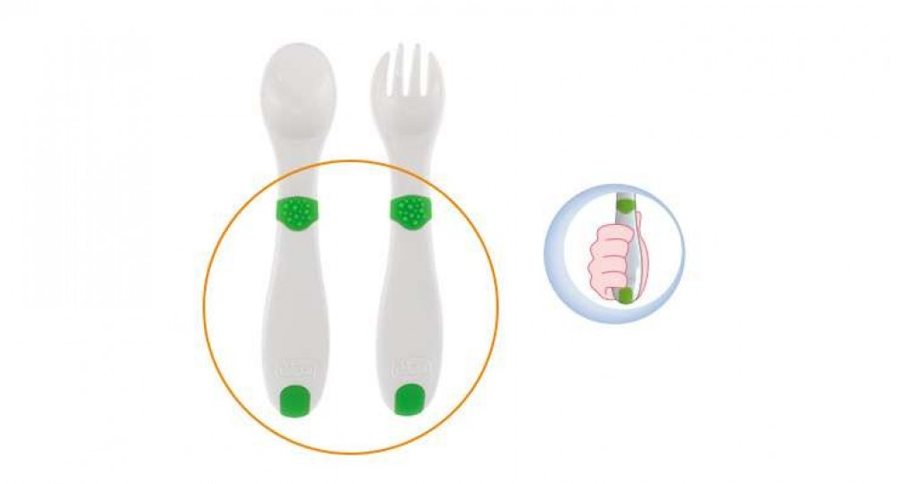 شوكة وملعقة للطفل تحفز أدوات الأكل الأولى هذه الطفل على الاكل لوحدة بشكل صحيح بفضل شكلها المريح والآمن. أطراف الشوكة المدورة تضمن سلامة فم و أيدي الطفل عند الأكل . مقابض مريحة مصممه لتسهل على الطفل المسك عند الأكل
