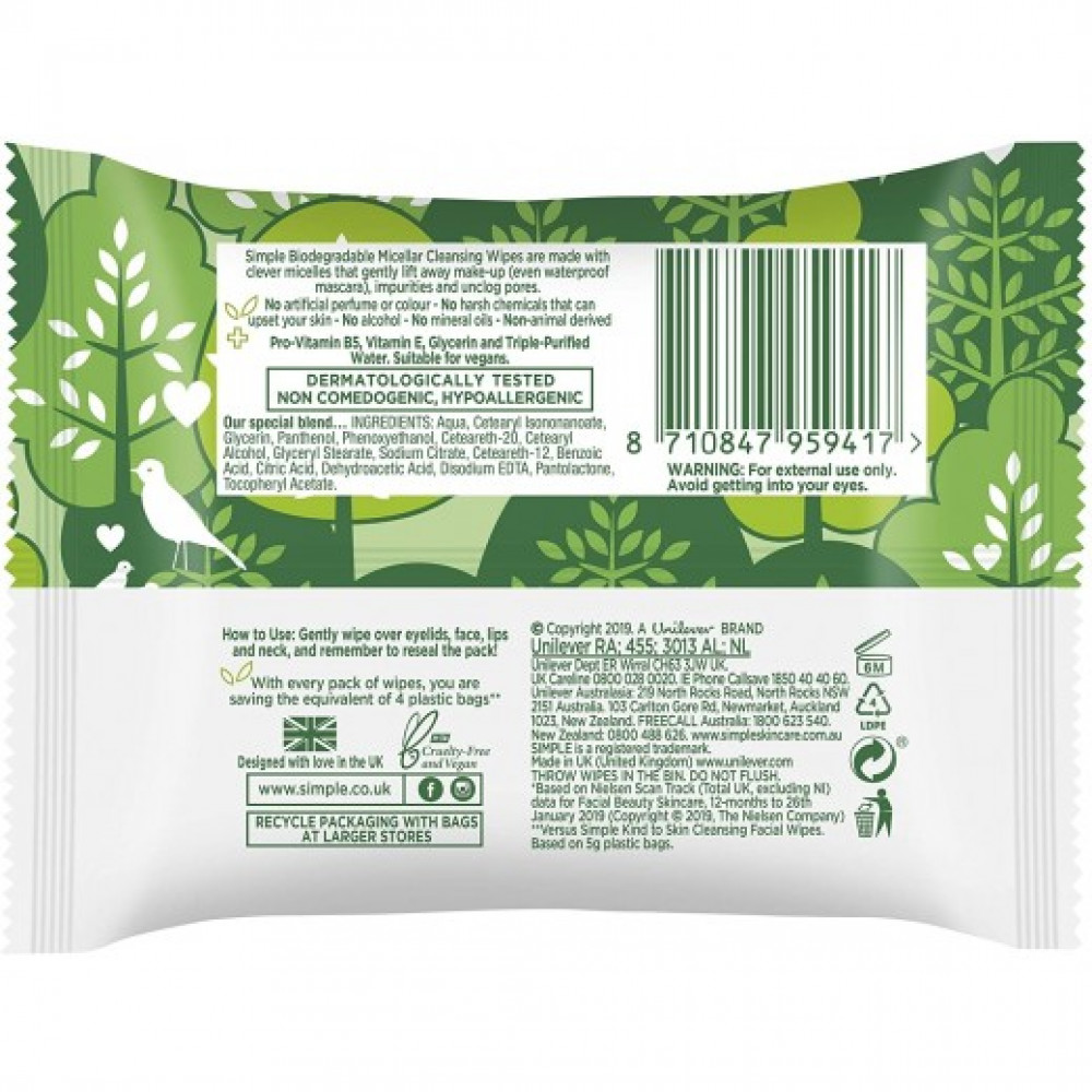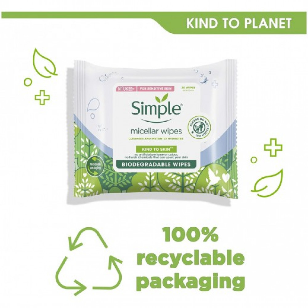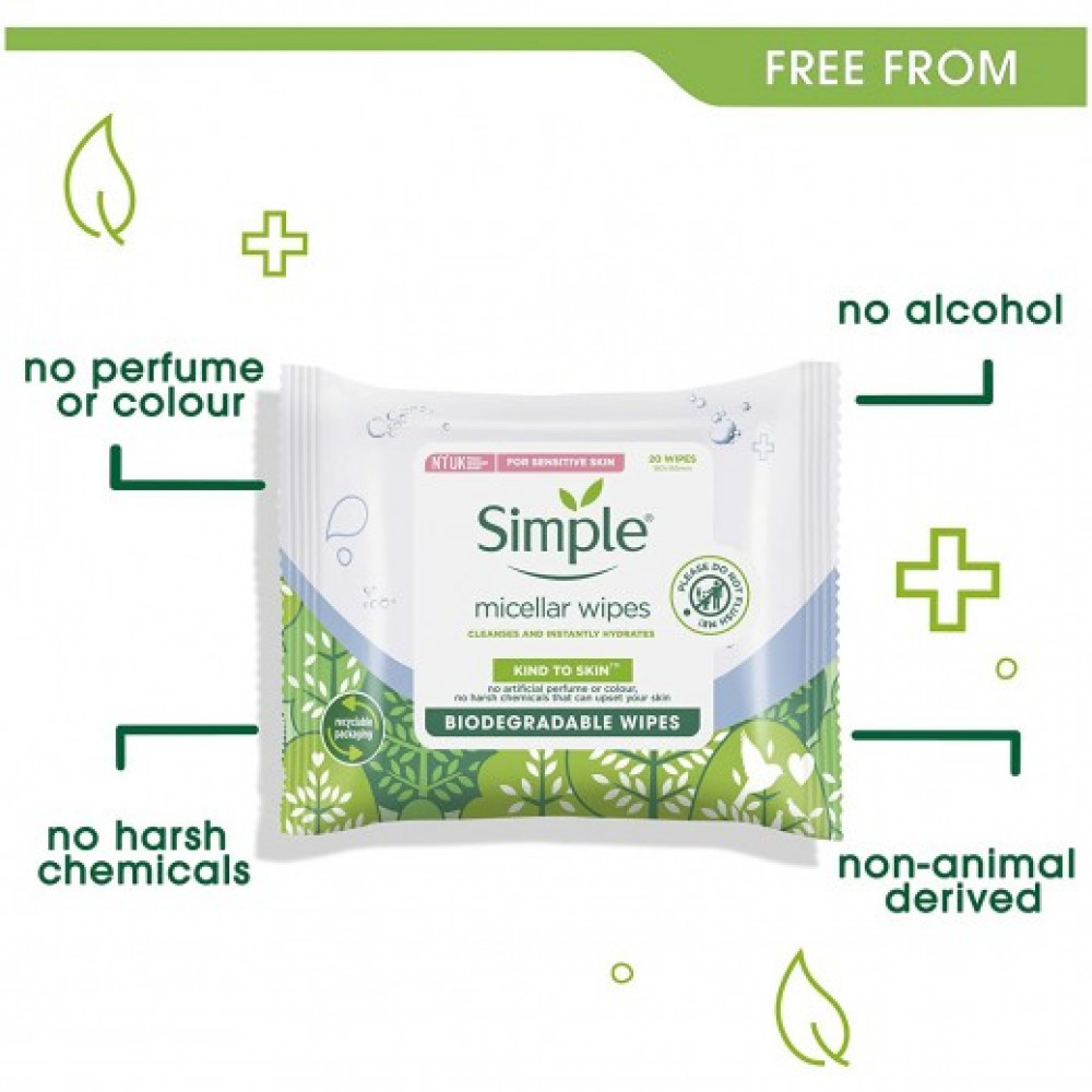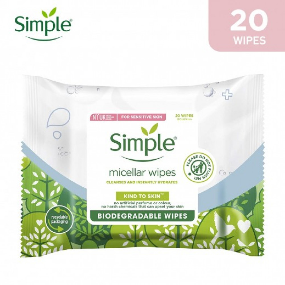 Simple Micellar بين تقنية ماء ميسيلار وشكل المناديل المبللة المريحة. إنها ألطف من المنظفات المعتمدة على الصابون لذلك لا تترك البشرة جافة أو مشدودة، ولكنها تترك شعورًا بالنظافة والانتعاش والترطيب على الفور.
