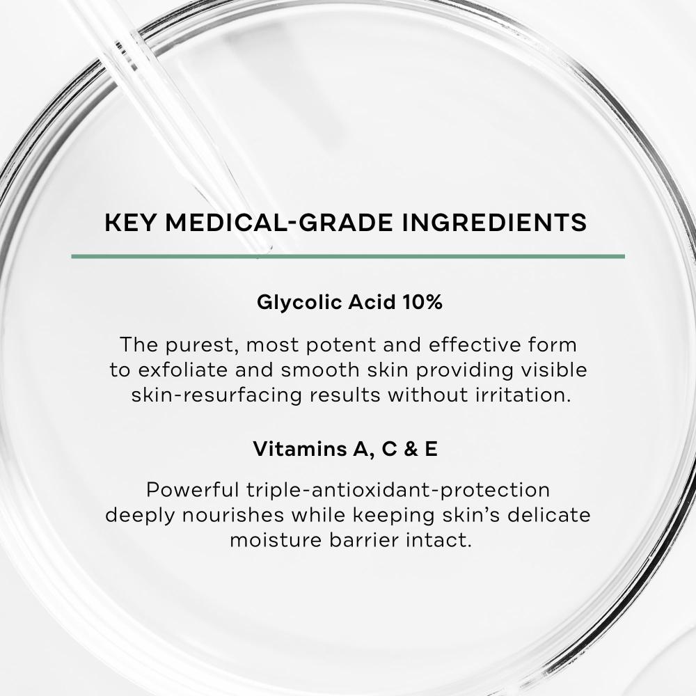 يقوم هذا المنظف الكريمي والمحتوي على مرطب الجليكول بنسبة 10% بتقشير البشرة بلطف وينظفها ويزيدها إشراقاً لمظهر أكثر صحة ونضارة. يحتوي عى مزيج غني من مضادات الأكسدة من بينها فيتامين A وC وE والشاي الأخضر ومساعد الإنزيم Q10 بالإضافة إلى حض الجليكوليك الكريستالي فائق النقاء بدرجة حموضة لطيفة 4.0 يعمل هذا المنظف المرطب للبشرة على تغذيتها وفي نفس الوقت يوفر لها حماية من التلف الناتج عن الجذور الحرة بفضل مضادات الأكسدة كما أنه مثالي للاستخدام كجزء من روتين علاج التقرن الشعري. تحتوي منتجات جليكوليك ايليت على أعلى تصنيف من حمض ألفا هيدروكسيل (AH) وفيتامين C وفيتامين A ومساعد الإنزيم Q10 ومتاح للاستخدام بدون وصفة طبية. وقد ثبت فاعلية حمض الجليكوليك في تقليل ترهل البشرة ومظهر التجاعيد والتصبغ وعلاج البشرة المعرضة لظهور الحبوب. كما أنه يساعد على تقليل الاحمرار والخطوط الدقيقة ويضيف الحيوية والشباب.