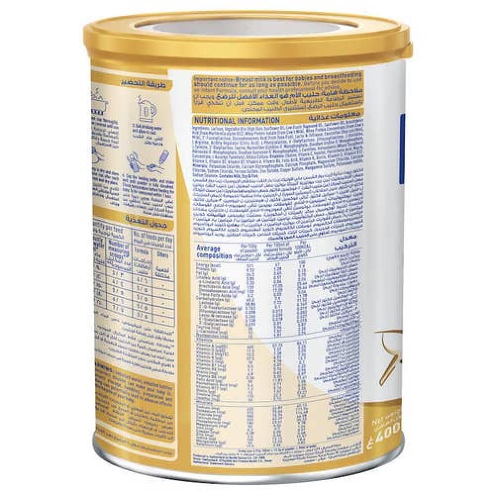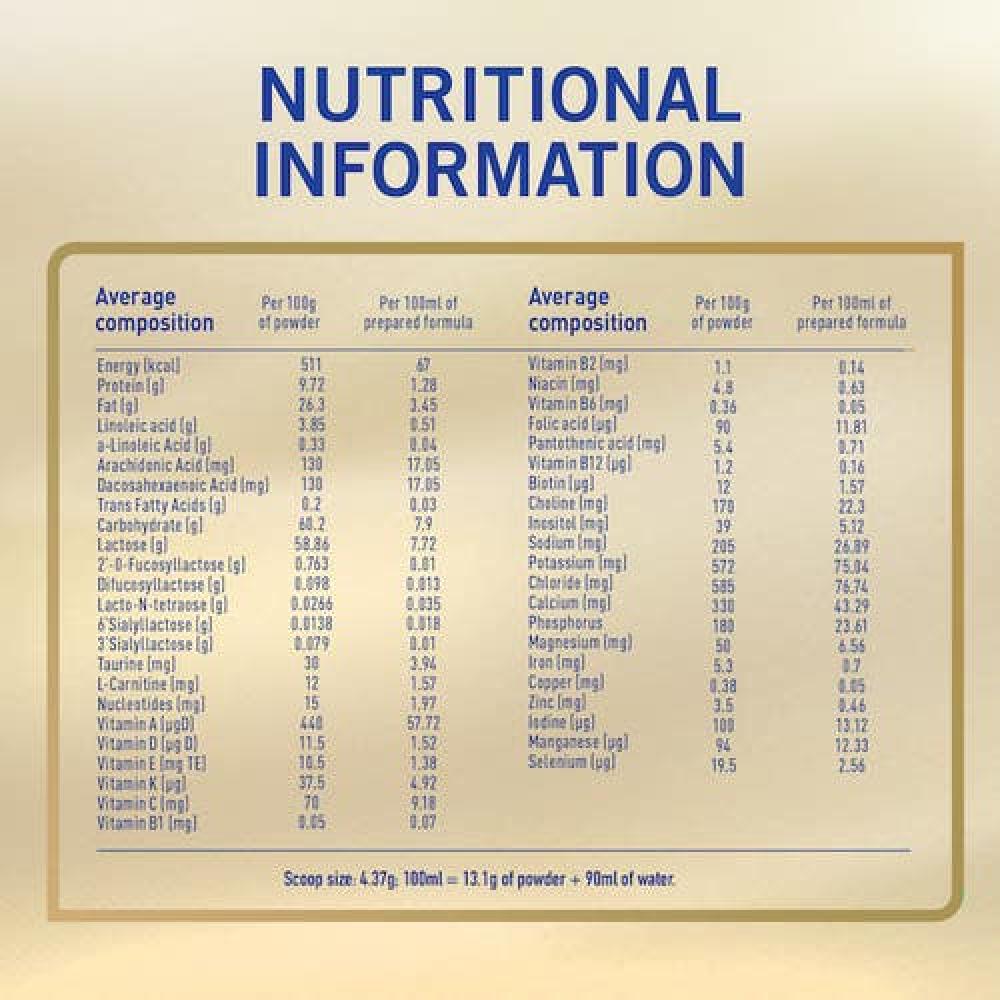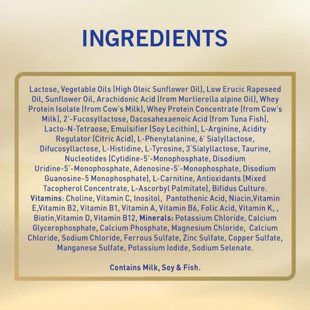 لاكتوز، زيوت نباتية [زيت دوار الشمس عالي الأوليك، زيت بذر اللفت منخفض الإيروسيك، زيت دوار الشمس، حمض الأراكيدونيك (من زيت مورتيريلا ألبينا)]، بروتين مصل الحليب المعزول (من حليب البقر)، بروتين مصل الحليب المركز (من حليب البقر)، 2-فوكسيل لاكتوز، حمض دوكوساهكسانويك (من سمك التونة)، لاكتو-ان-تتراوز، عامل استحلاب (ليسيثين الصويا)، ل-أرجينين، مادة منظمة للحموضة (حمض الستريك)، ل-فنيل الانين، 6-سياليل لاكتوز، ثنائي فوكسيل لاكتوز، ل-هيستيدين، ل-تيروسين، 3-سياليل لاكتوز، تورين، نيوكليوتيدات (سيتيدين-5-أحادي الفوسفات، يوريدين ثنائي الصوديوم-5-أحادي الفوسفات، أدينوسين-5-أحادي الفوسفات، جوانوسين ثنائي الصوديوم-5-أحادي الفوسفات)، ل-كارنيتين، مضادات الأكسدة (خليط توكوفيرول مركّز، بالميتات ل-أسكوربيل)، مستنبت بيفيدوس.