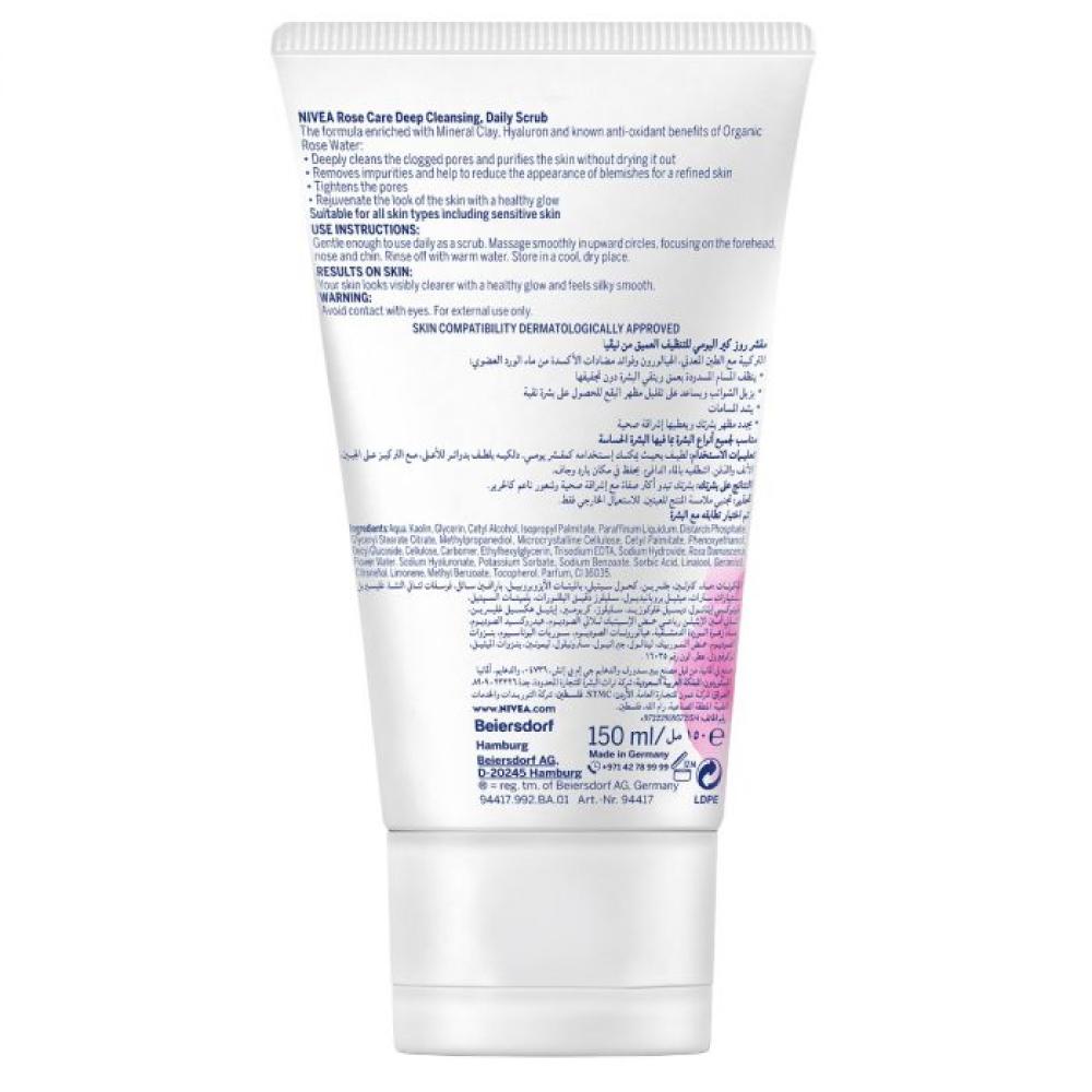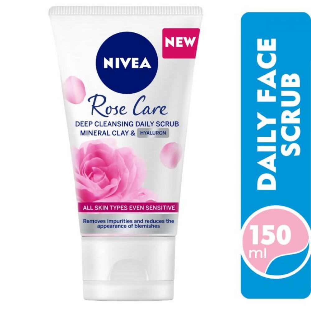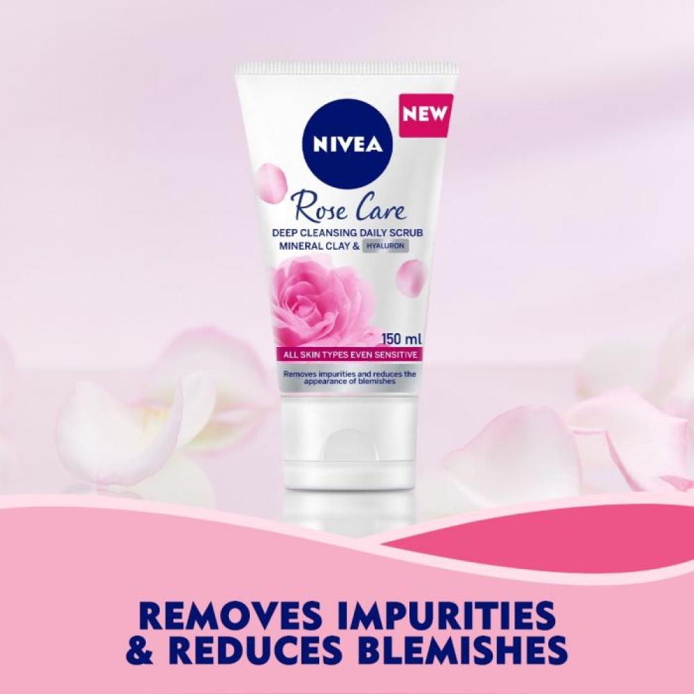 مقشر الوجه اليومي للتنظيف العميق روز كير من نيڤيا بتركيبة غنية بالطين المعدني والهيالورون والفوائد المعروفة المضادة للأكسدة لماء الورد العضوي.