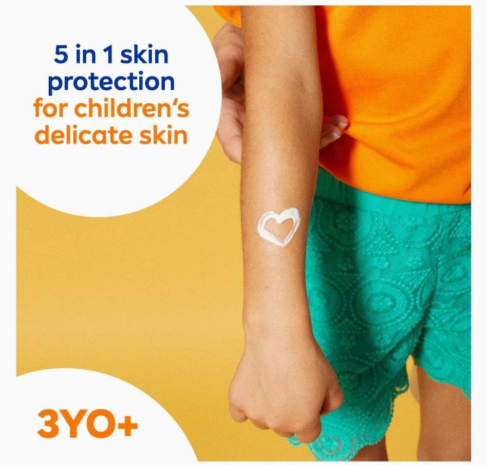 - تركيبة لطيفة ومقاومة للماء، مصممة خصيصاً لبشرة الأطفال الحساسة.