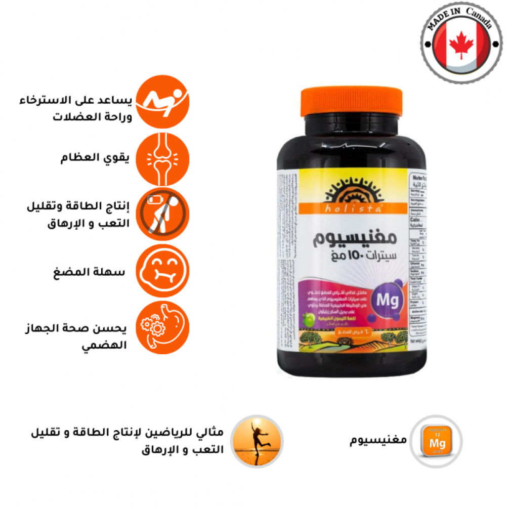 تقدم هوليستا سترات المغنيسيوم على شكل حبوب للمضغ لذيذة وخالية من السكر بنكهة الليمون الطبيعية