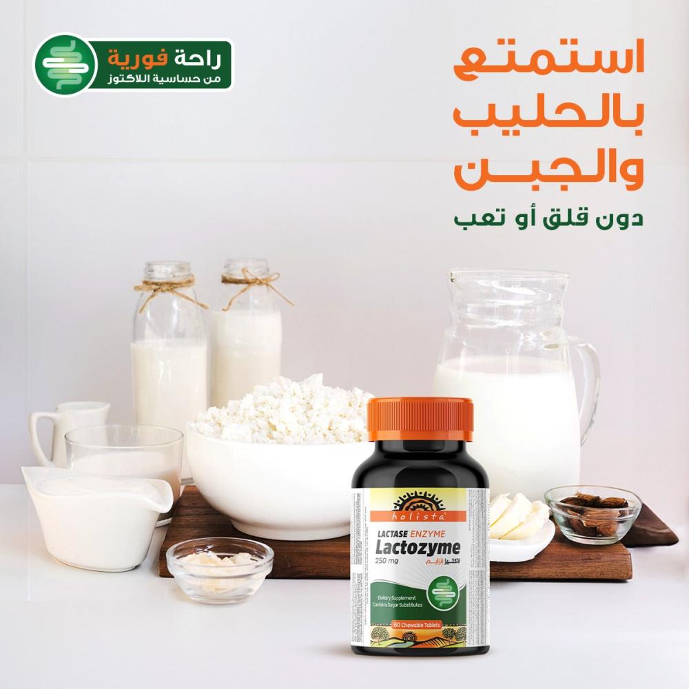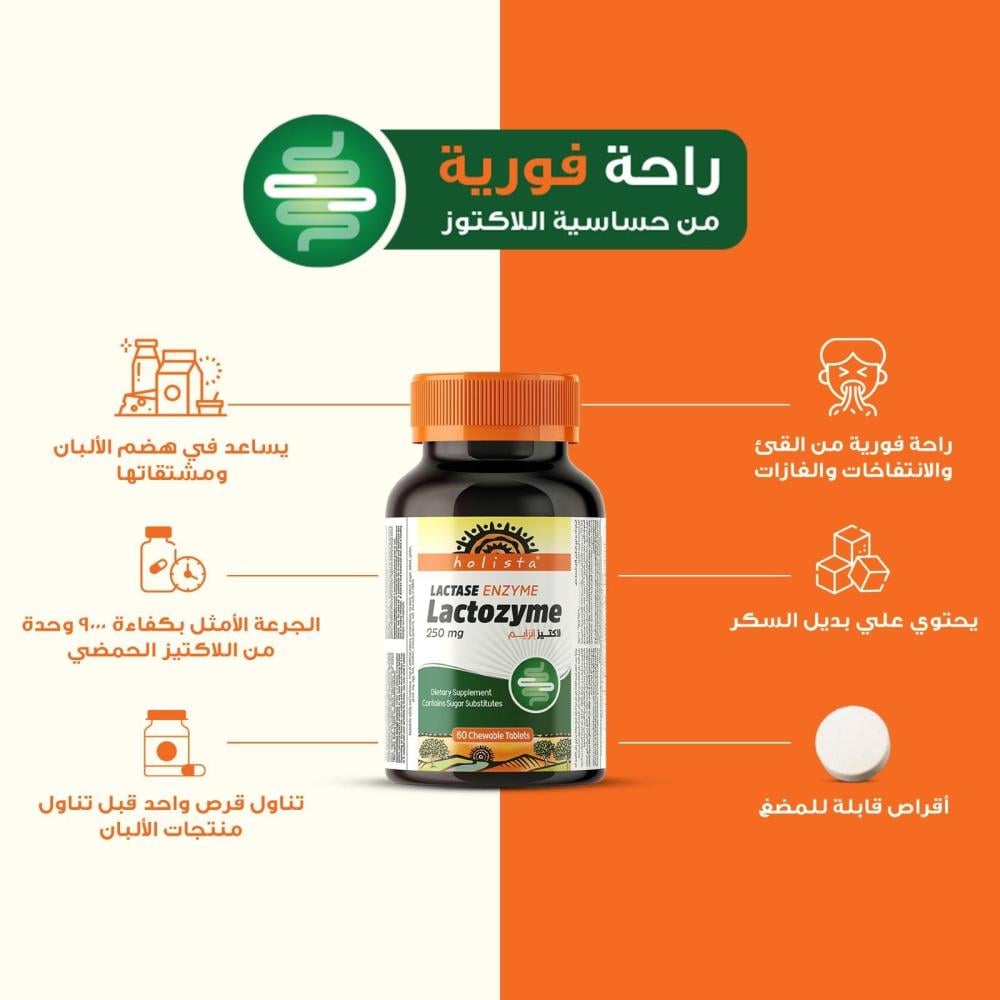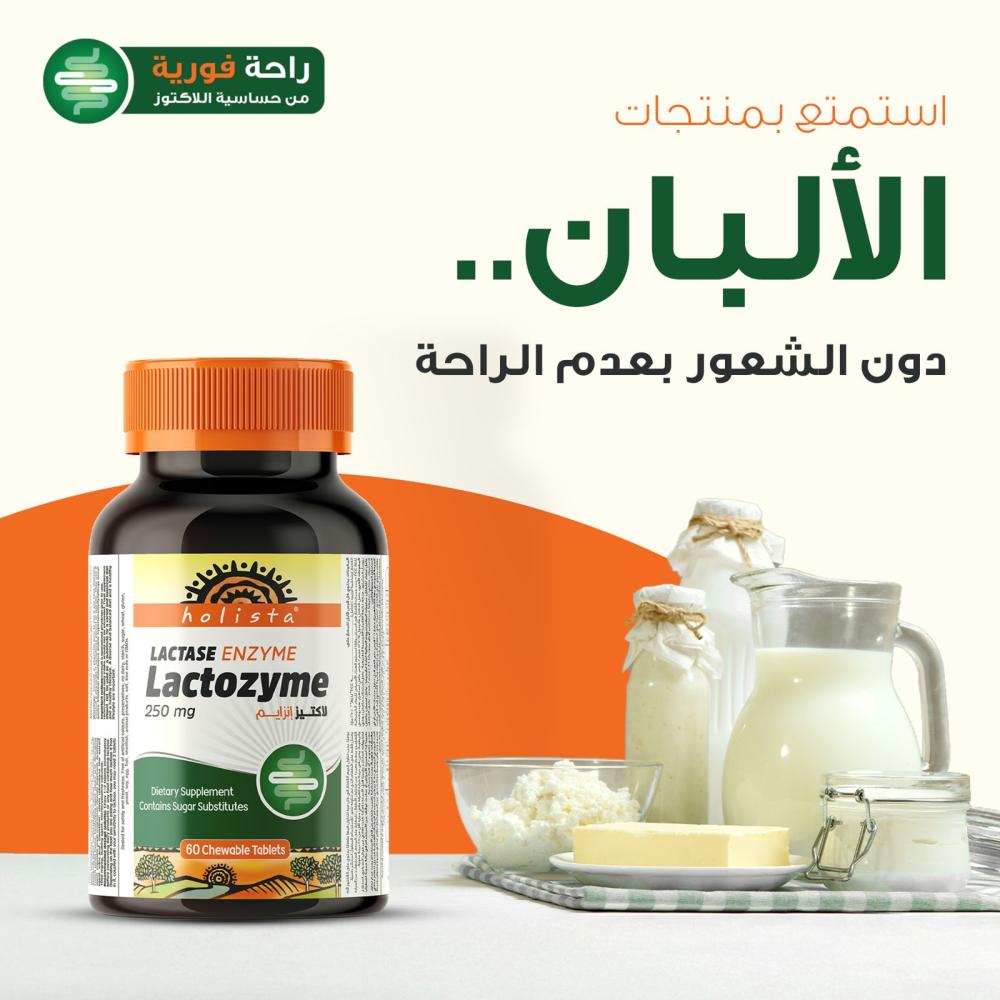 هوليستا لاكتوزيم يحتوي علي ٩٠٠٠ وحدة من انزيم الاكتاز ٢٥٠ مغ ، الذي يساعد في منع أعراض حساسية اللاكتوز ويساعد في هضم منتجات الألبان، حيث ان حساسية اللاكتوز هي عدم قدرة الجسم على هضم اللاكتوز (سكر الحليب)، نتيجة نقص إنزيم اللاكتاز، الذي يتحمل مسؤولية تحلل اللاكتوز في الجهاز الهضمي ، مما يخفف الأعراض غير المريحة للإسهال والغازات والانتفاخ الناجمة عن حساسية اللاكتوز.