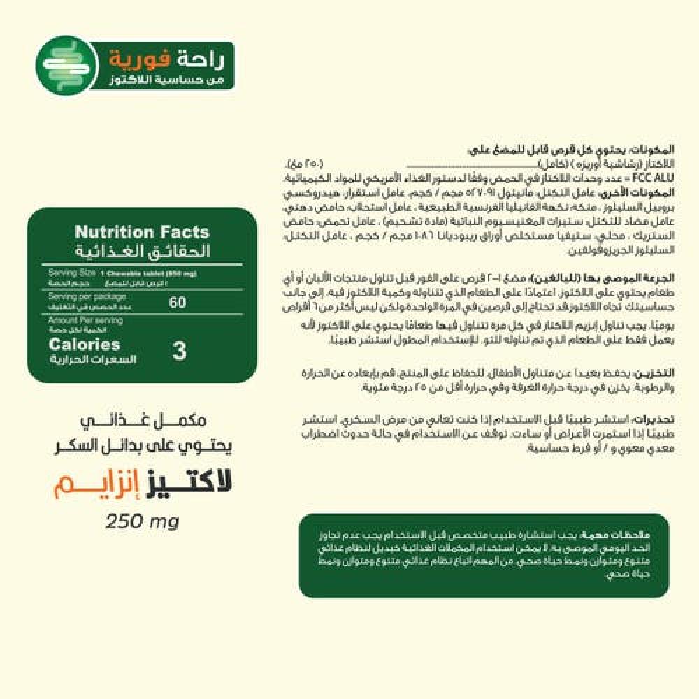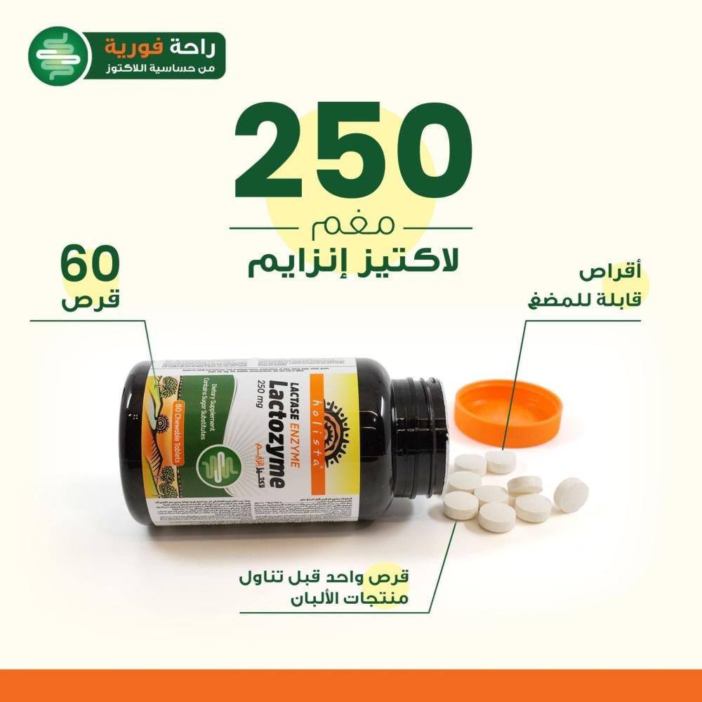 يحتوي على ٩٠٠٠ وحدة من إنزيم اللاكتاز ٢٥٠ مغ.