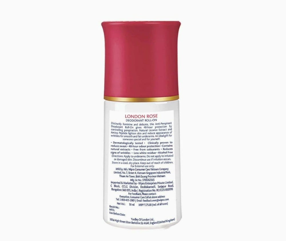 الرول العطري الوردي من ياردلي لندن سيسمح لك باحتضان النضارة، كل هذا بفضل عطره الانثوي الرائع والمميز. يوفر حماية لمدة 48 ساعة من خلال التحكم في التعرق. كما أنه يعمل على تفتيح البشرة وتقليل التجاعيد بفضل مستخلصات عرق السوس الطبيعية والببتيدات الأمينية.