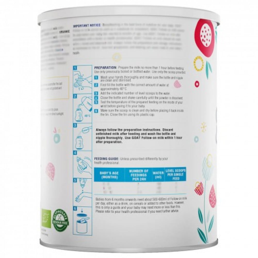 المكونات:حليبماعز كامل عضوي.اللاكتوز العضوي (حليب);الزيوت النباتية العضوية (زيت دوار الشمس العضوي,زيت بذور اللفت العضوي) ;الجلاكتوأوليجوسكاريد العضوي (GOS) (الحليب);الزيت الغني بحمض الدوكوساهيكسانويك (دي اتش ايه)(الاسماك);الزيت الغني بحمض الأراكيدونيك(ايه ايه)(الحليب);المعادن(كربونات الكالسيوم،سترات الصوديوم،كلوريد المغنسيوم،لاكتات الحديد،كبريتات النحاس،كبريتات المنغنيز،يوديد البوتاسيوم،سيلينت الصوديوم);فيتامينات(حمض الأسكوربيك،كوليكالسيفيرول،أسيتات دل ألفا توكوفيرل،النياسيناميد،حمض البانتوثنيك،أسيتات الريتينيل،هيدروكلوريد الثيامين،هيدروكلوريد البيريدوكسين،حمض الفوليك،فيتوميناديون،البيوتين،سيانوكوبالامين);ل سيستين;ل تريبتوفان ; ل - التيروزين.