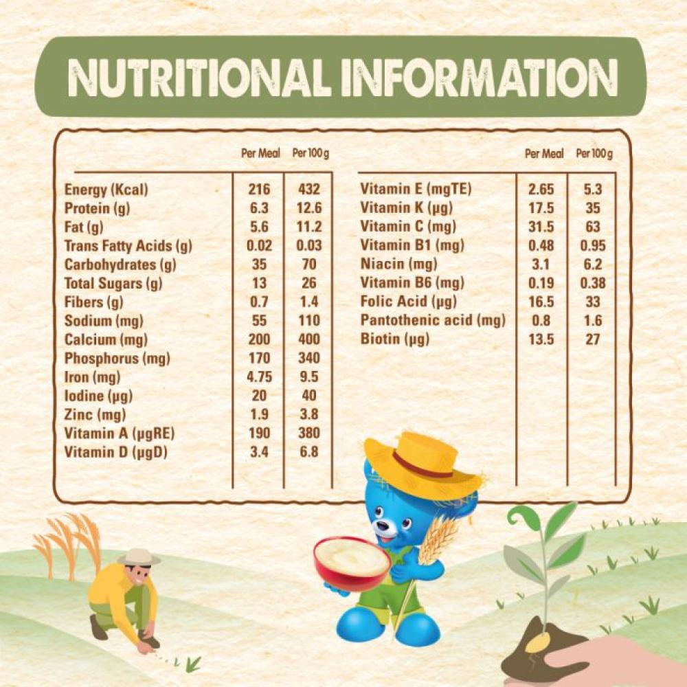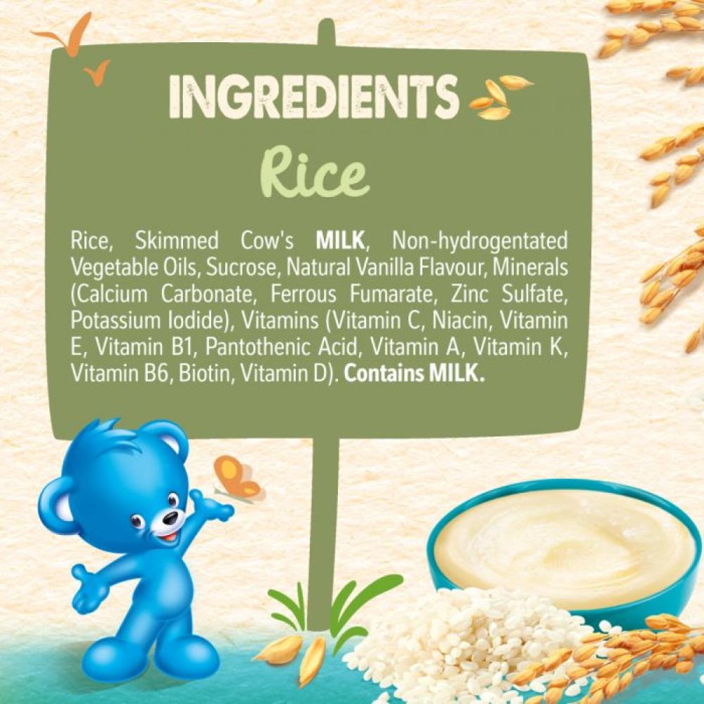 - دقيق الأرز الأبيض، حليب مجفف مقشود، سكروز، أولين النخيل، زيت بذر اللفت منخفض حامض الإيروسيك، زيت جوز الهند، زيت دوار الشمس، نكهة الفانيلا، مستنبت البيفيدوس، معادن وفيتامينات.