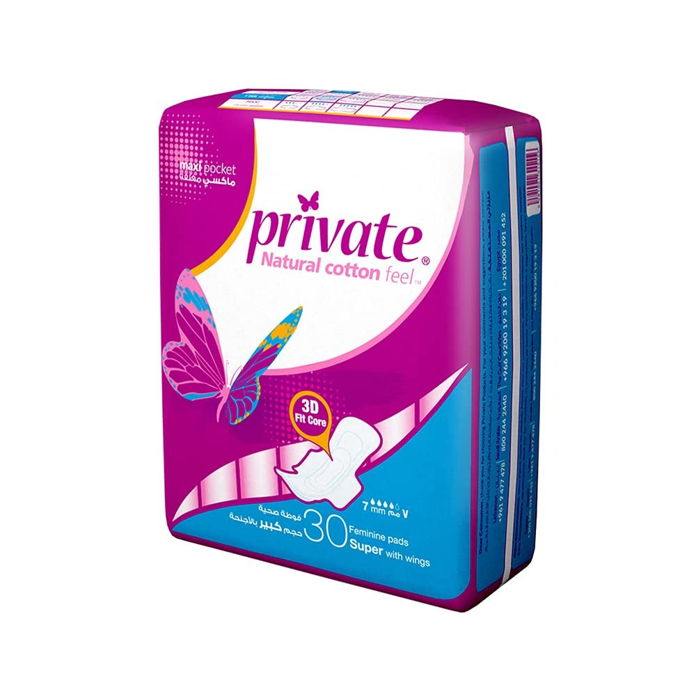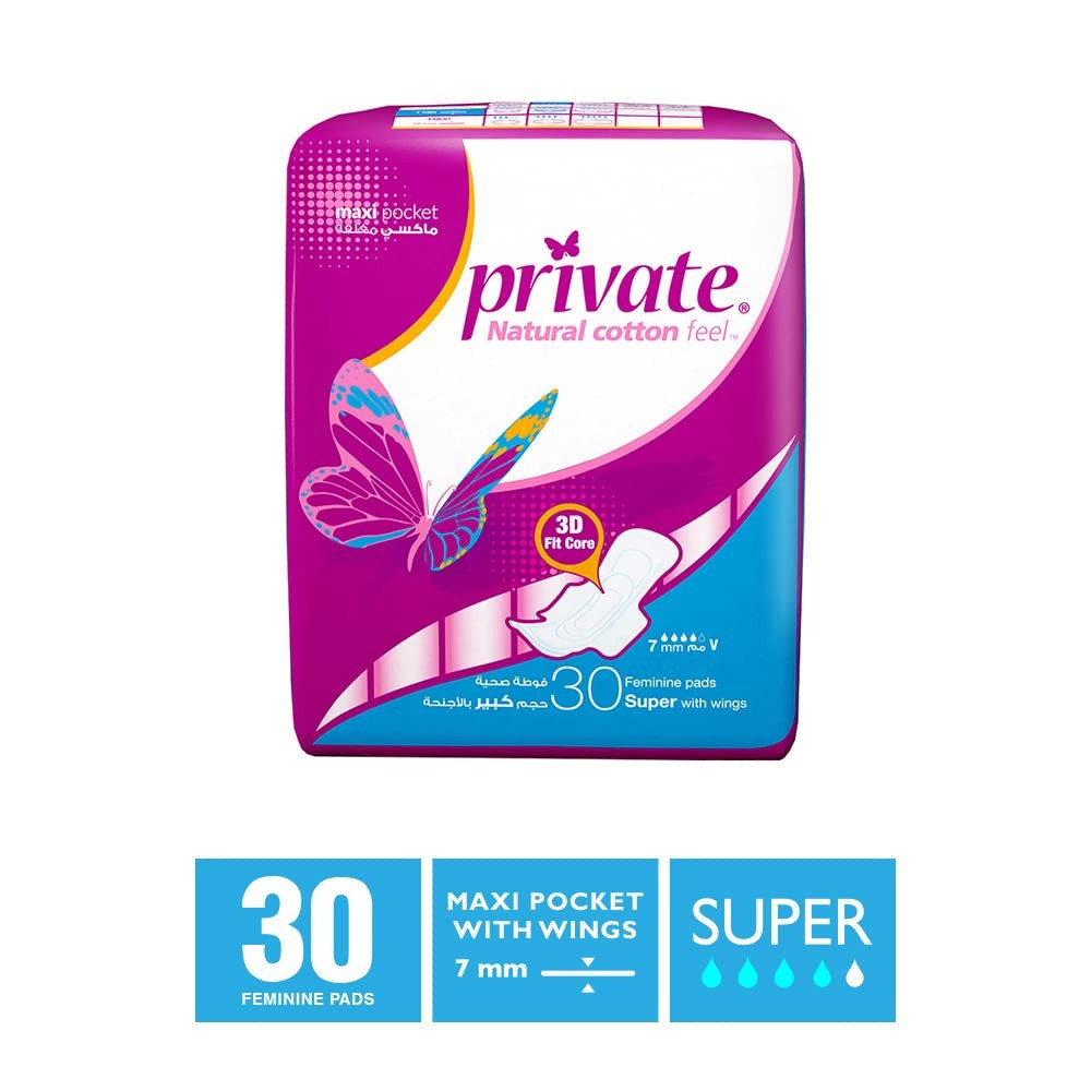 برايفت فوط صحية مـاكسى سوبر، حجم كبير بالأجنحة - 30 فوطةبرايفت ماكسي بوكيت تجمع بين الحماية والأناقة. تحتوي برايفت ماكسي بوكيت، حجم سوبر على 30 فوطة مضغوطة تتميّز بغلاف بملمس القطن الطبيعي لمنحك أقصى درجات الخصوصية والأمان.