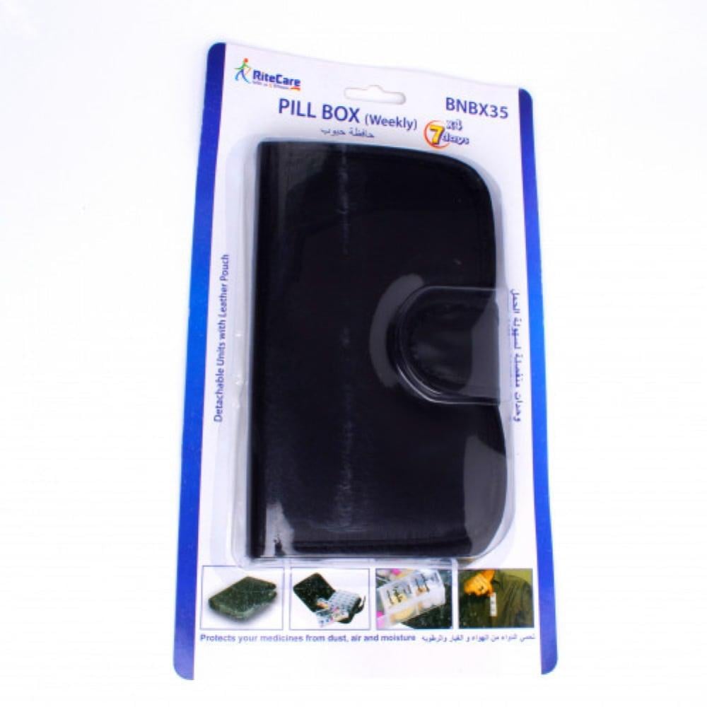 حافظة الأدوية الأسبوعية Rite care موديل BNBX35 هي منظم أدوية مصمم لتنظيم الأدوية حسب أيام الأسبوع وأوقات اليوم، وهي تتضمن 7 علب كل منها مقسم إلى 4 أقسام. تتميز بتصميمها الخفيف والمحمول وسهولة استخدامها، مع وجود علب شفافة تسمح بمعاينة الحبوب، وكلمات مكتوبة باللغتين العربية والإنجليزية ولغة برايل.