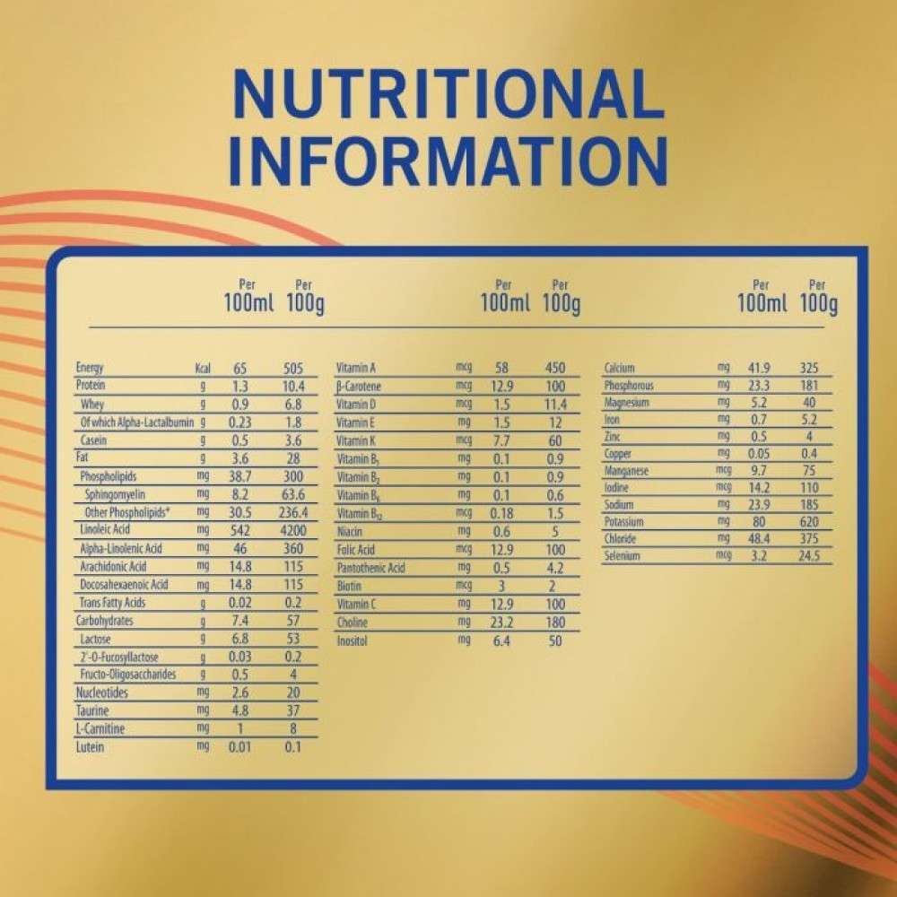 • اللفت منخفض الإيروسيك، زيت دوار الشمس، حمض الأراكيدونيك من مصدر مورتيريلاألبينا[، بروتين مصل الحليب )من حليب البقر(، فراكتو-أوليجوسكرايد، حمض دوكوساهكسانويك )من سمك التونة(، عامل استحلاب )ليسيثين الصويا(، 2-فوكسيل لاكتوز، ل-تيروسين، تورين، نيوكليوتيدات )سيتيدين5 أحادي الفوسفات، يوريدين ثنائي الصوديوم5-أحادي الفوسفات، أدينوسين5-أحادي الفوسفات، إينوسين ثنائي الصوديوم5-أحادي الفوسفات، جوانوسين ثنائي الصوديوم5-أحادي الفوسفات(، مضادات الأكسدة)خليط توكوفيرول مركز، بالميتات ل-أسكوربيل(، ل-تريبتوفان، ل-كارنيتين، مواد منظمة للحموضة )حمض الستريك، هيدروكسيد البوتاسيوم(، لوتين.
