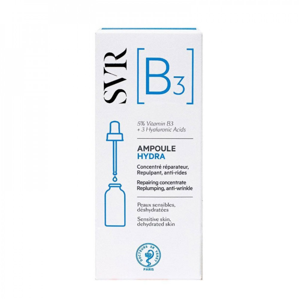 فيتامين ب 3 ، المعروف أيضًا باسم النياسيناميد ، هو مكون نشط متعدد التصحيحات يقوي حاجز الجلد ويعيده. يتركز SVR بنسبة 5٪ لإصلاح الجلد التالف. إلى جانب 3 أحماض الهيالورونيك بأوزان جزيئية مختلفة (متوسطة وعالية وعالية جدًا) ، يعمل فيتامين B3 على ترطيب البشرة بشكل مكثف ، وتقويتها ، وملؤها بالجفاف.